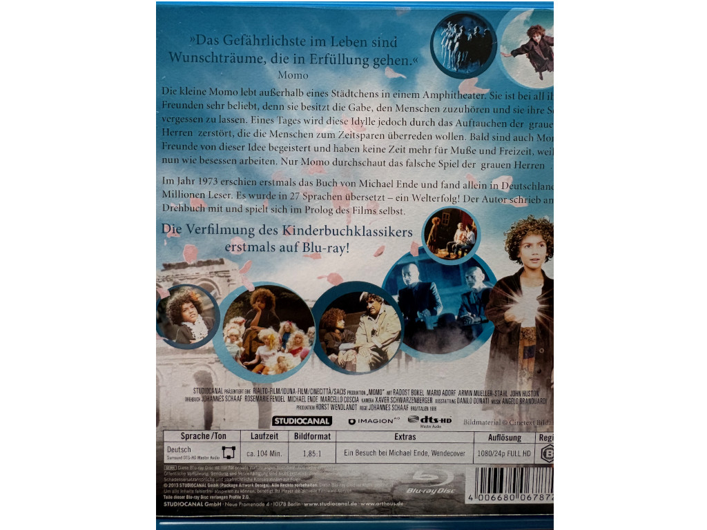 Beim betrachten der Rückseite des Covers der Blu-Ray von Momo (alte Fassung) frage ich mich ob es das Buch „Momo“ in der DDR überhaupt gab. Falls das Buch in der DDR nicht erhältlich war empfehle ich den hinzugekommenen Bürgern der Bundesrepublik Deutschland das Lesen des Originalwerkes von Michael Ende. Die alte Verfilmung ist sehenswert und sollte ebenfalls nicht in Vergessenheit geraten.
